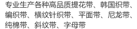 主營產品:提花織帶,韓國織帶,編織帶,仿尼龍織帶,緞帶/羅紋帶,子母織帶,熱轉印織帶,間色織帶