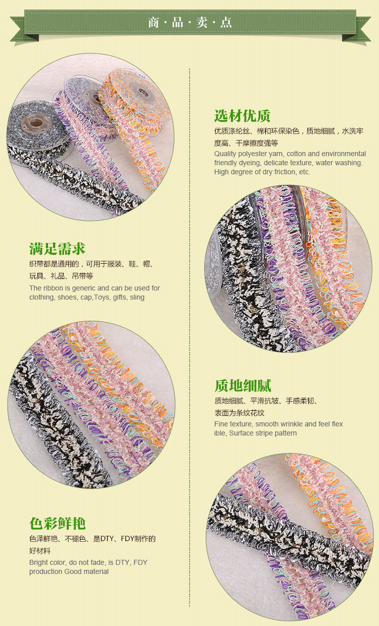 主營產品:提花織帶,韓國織帶,編織帶,仿尼龍織帶,緞帶/羅紋帶,子母織帶,熱轉印織帶,間色織帶