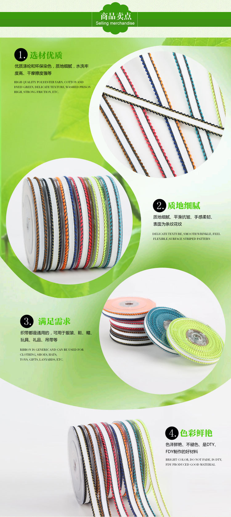 主營產品:提花織帶,韓國織帶,編織帶,仿尼龍織帶,緞帶/羅紋帶,子母織帶,熱轉印織帶,間色織帶
